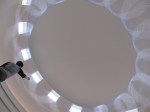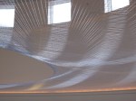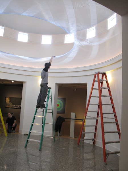 Warren Seelig sent these photos of his current installation at the Farnsworth Museum in Rockland, Maine. Titled Oculus, this installation is in the rotunda of the museum and is constructed of thousands of strands of monofilament intersecting in harmony to form a circular opening beneath the windows.