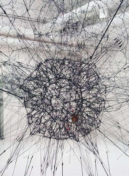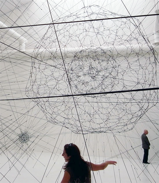 I’m jealous of Tomas Saraceno’s work. Its true. His installations of molecular dream-scapes made of bungie cords and rope make me want to drop everything, stock up on screw-eyes and cord and go to town out in my studio making impossible spaces.
