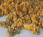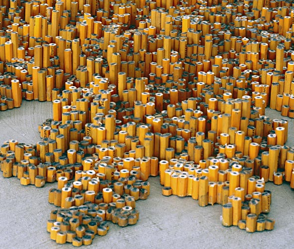 Tara Donovan manipulates mundane materials into massive constructions, landscapes and volumes that transcend the material they are created from. Paper plates, plastic cups, pencils and the like become the individual motifs of a larger naturalistic pattern.