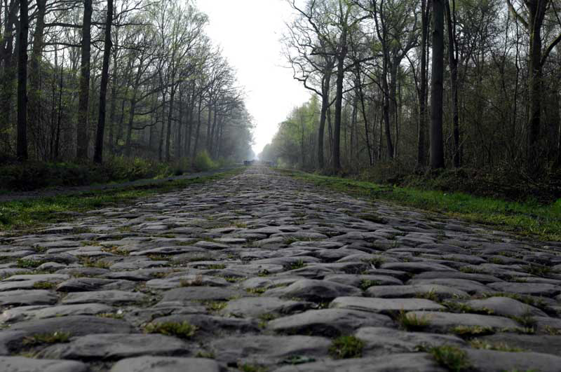 I’ll answer the second question first: Paris-Roubaix (A.K.A. “A Sunday in Hell”, “l’enfer du Nord”, “The Hell of the North”, “Queen of the Classics”) is possibly the single hardest day of bike racing on the professional circuit. It is a 260km race that takes place in early April (next weekend!) on the country roads of Northern France, of which about 50km are cobblestones. Not brick path, nor stone look, but Honest to god uneven cobblestones from days of old. This 100 year old race chews up riders, equipment, and tires and leaves them on the side of the road. It is a monument of cycling that puts high demands